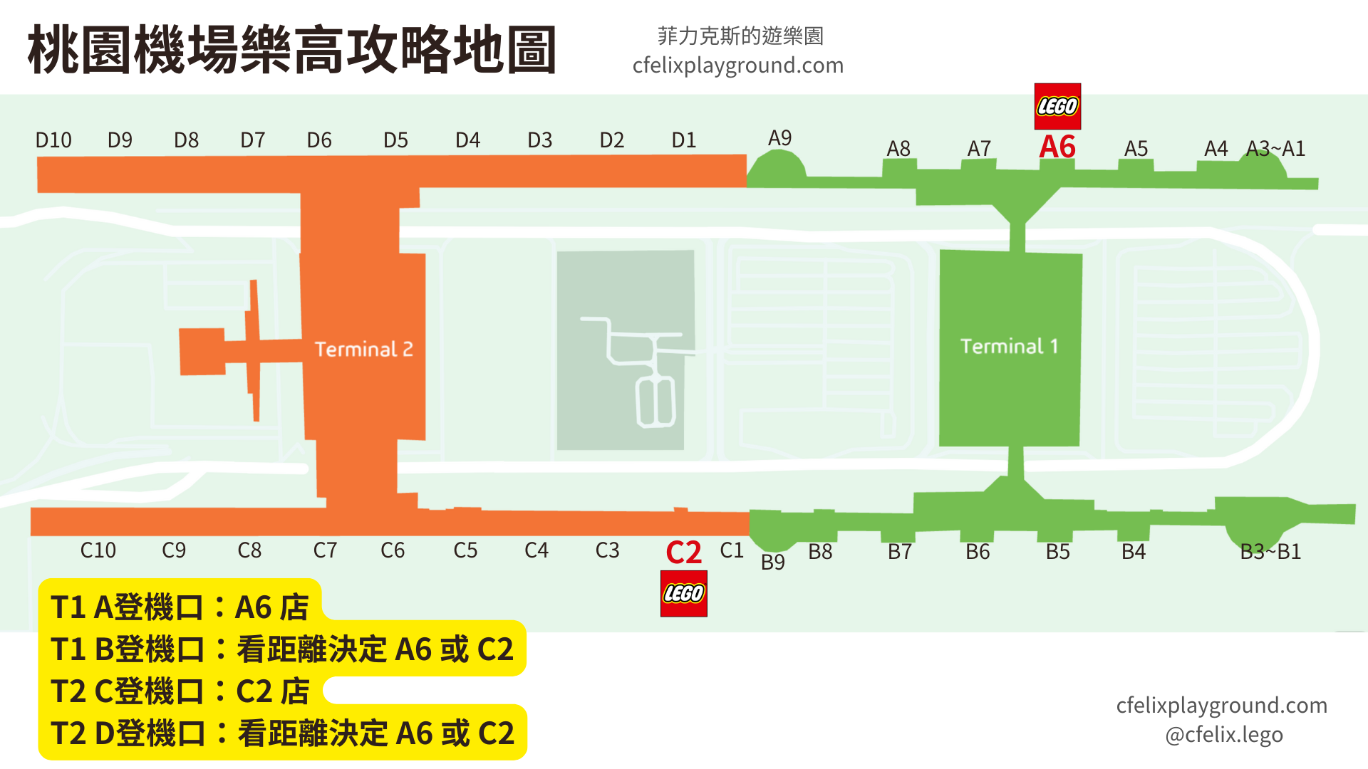 桃園機場目前有二間 LEGO Airport Store,分別在「第一航廈的 A6 登機口」旁以及「第二航廈的 C2 登機口」旁。營業時間是早上 6 點至晚上 11 點。