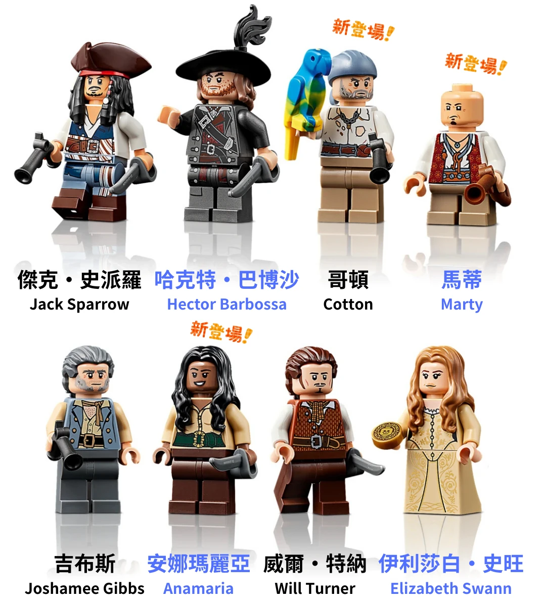 ▲ 除了船首的女神像,10365 還附上了八隻全新的人偶!選角是根據電影第一集《神鬼奇航:鬼盜船魔咒》,包含初次化身樂高小人偶的安娜瑪麗亞、哥頓和馬蒂!這當中只有哥頓和馬蒂是單面表情,其他六人都是雙面表情。