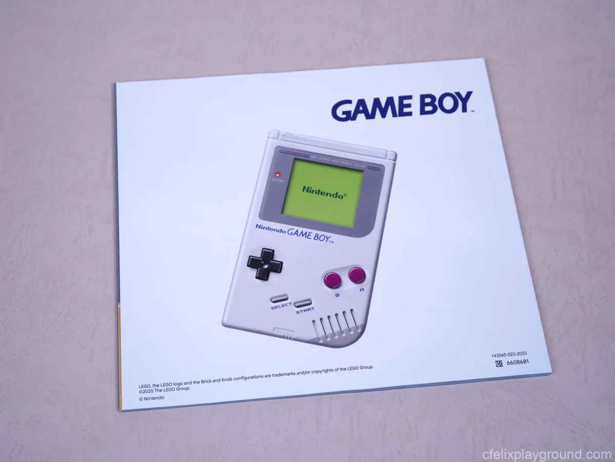 ▲ 說明書維持一貫極簡(?)的設計,封面是磚拼的 72046,封底的實體 Game Boy 算是個小驚喜。不過內頁很不錯,花了幾頁篇幅介紹 Game Boy 的歷史和二個卡帶。