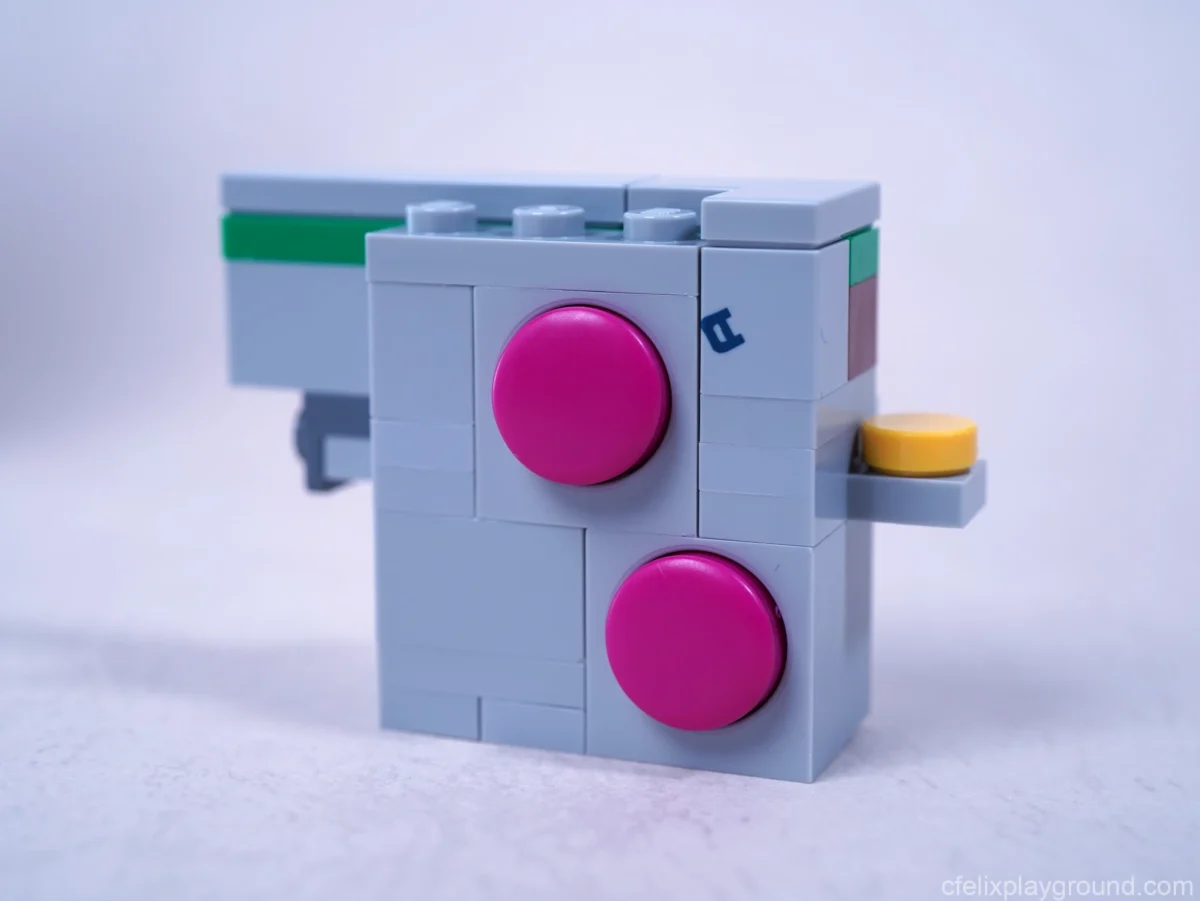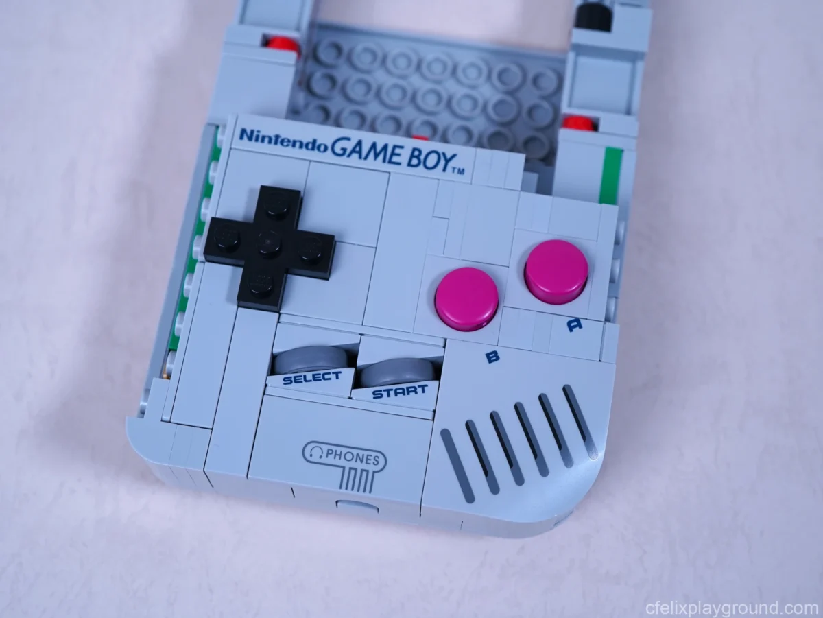 ▲ 第三包完成!右下角的 4 x 4 圓角磚(編號 6567190)也是全新獨佔的零件!其中 SELECT / START 按鍵是用全新深灰色的輪胎零件。所有的按鈕都可以按,而且回彈的手感還不錯,還原度真的很高!