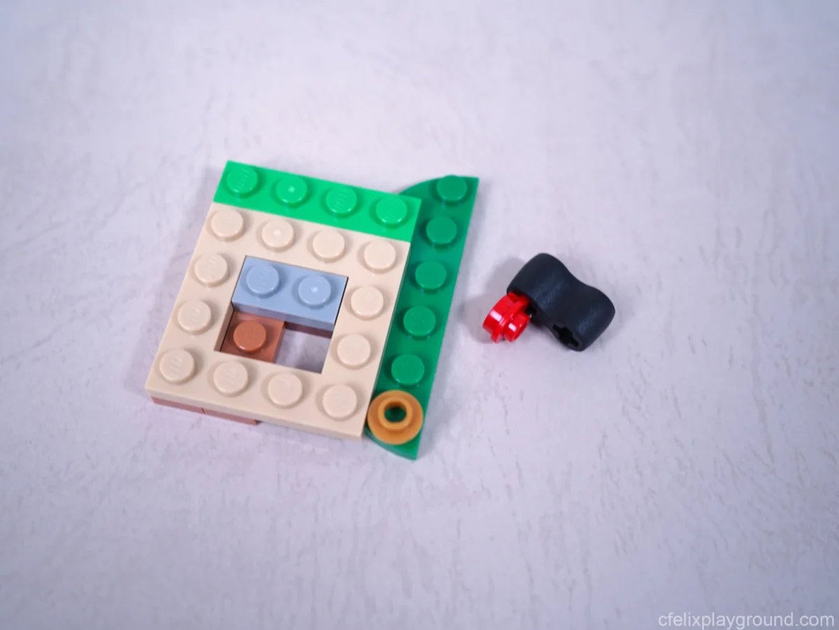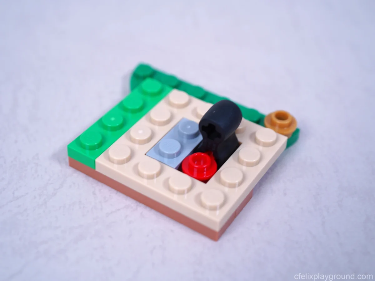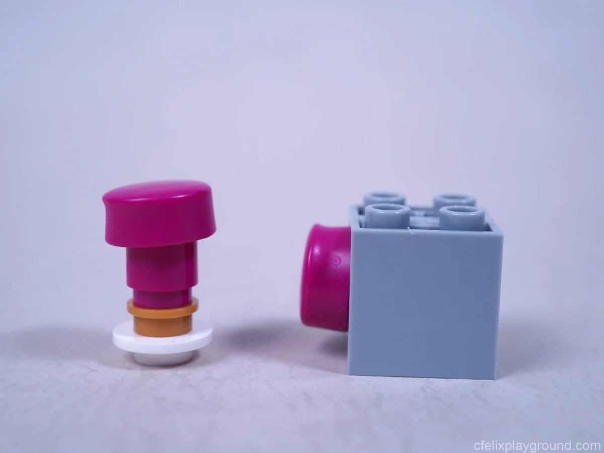 ▲ 接著來到 A/B 按鈕,2 x 2 x2 有孔的灰色磚(編號 6551141)應該是全新的零件,裡面斜對角的地方有四個凸點。圓盤從下面套進去,再蓋上按鈕就完成了!值得一提的是,A/B 按鈕是《哈利波特》裡正氣師「金利·俠鉤帽」的帽子,是全新的顏色。