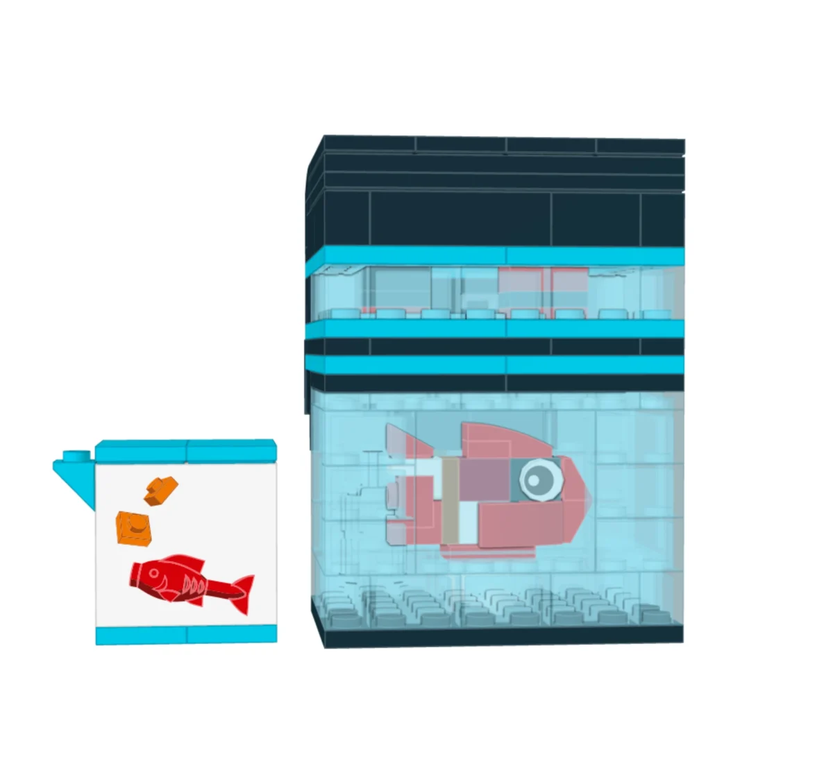 ▲ 仔細看過濾器裡面還卡了一隻磚拼的小魚,另外還附上一個印刷的魚飼料零件,實在太可愛啦!