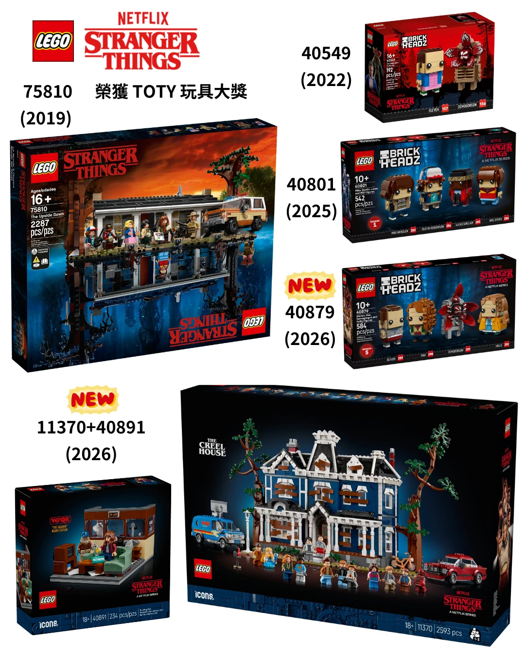 ▲ 到明年一月為止,正式發行的 LEGO x Stranger Things 總共有六盒,除了本篇介紹的「11370 克里爾家」和「40891 WSQK 電台」,2019 年搭配第一季的劇情推出了「75810 The Upside Down 顛倒世界」,並於這幾年陸續出了好幾盒 BrickHeadz。