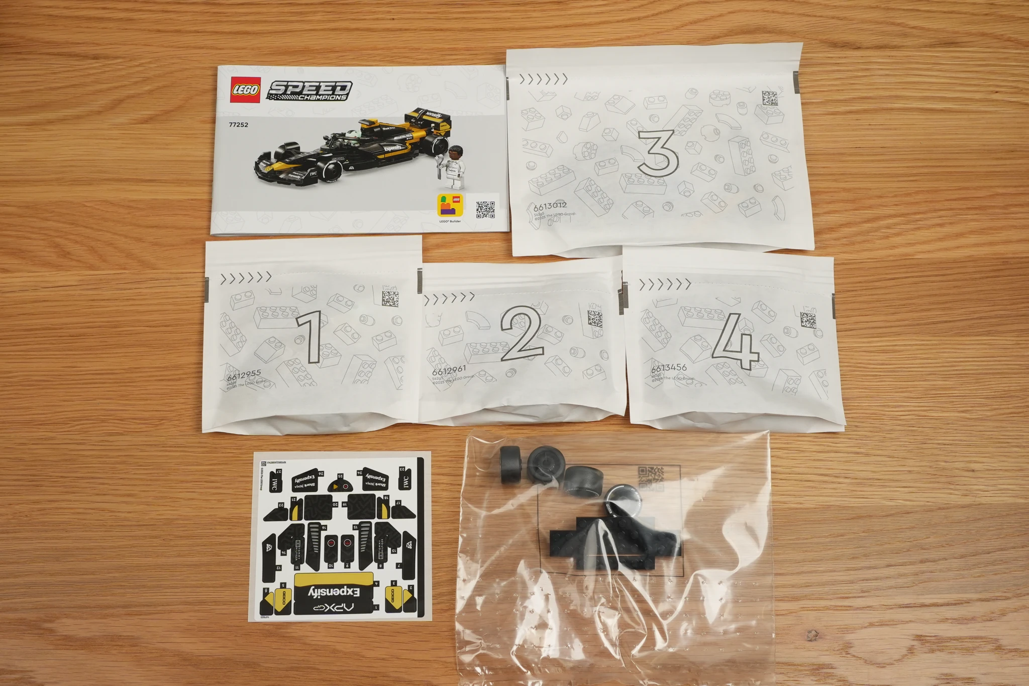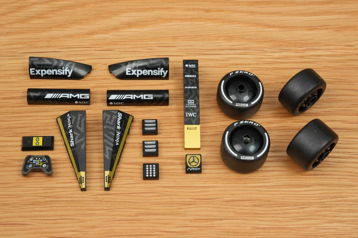 ▲ 雖然不少貼紙,但 77252 也給了 13 個印刷件,以及四顆前窄後寬的倍耐力輪胎!