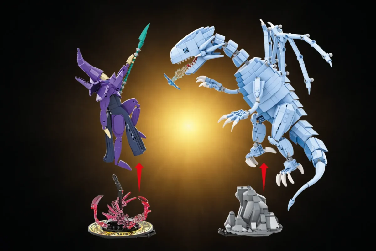 ▲ 總共使用 1585 片積木,磚拼的黑魔導和青眼白龍非常逼真,有許多可動的關節,並附上展示架以及底部迷你卡牌。
